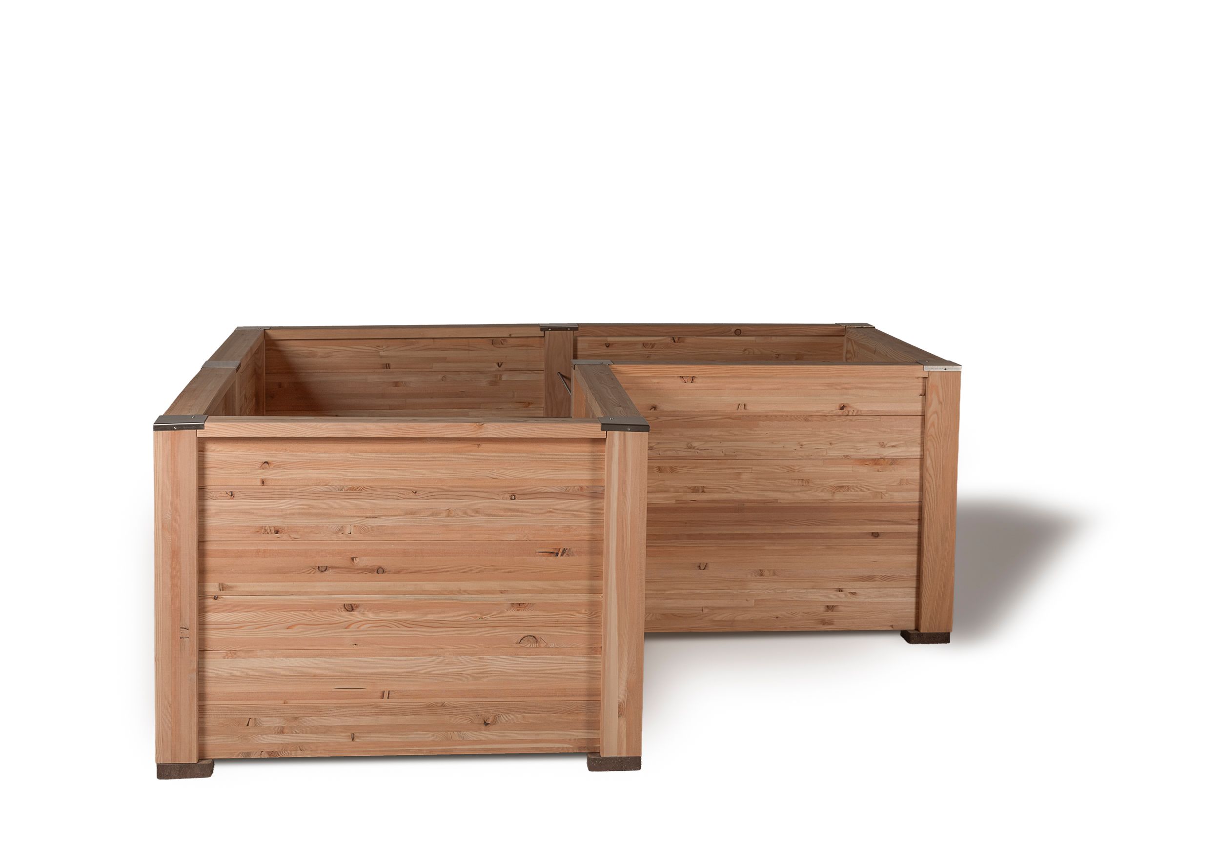 Timberra Hochbeete sind im patentierten Schwalbenschwanz - Verbundsystem gefertigt. Die vorgefertigten Holzelemente für die Seitenwände müssen ähnlich einem modularen Baukastensystem nur mehr in die Steher eingeschoben werden. Dann noch die Handläufe und Steherabdeckungen drauf, fertig ist das Hochbeet. Das Hochbeet Concordia Basic + Erweiterung + Winkel besteht aus einem Basismodul, einem Erweiterungsmodul und einem Winkelmodul.