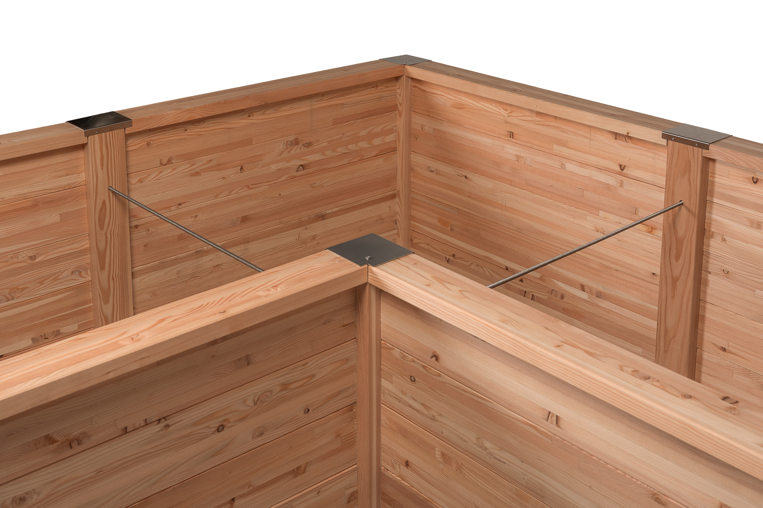 Die Timberra Hochbeete sind aus der besonders widerstandsfähigen und dauerhaften Tauernlärche gefertigt. Das Holz ist unbehandelt. Die statische Wandstärke beträgt 4,6 cm. Die Abdeckungen für die Steher sind aus Edelstahl und bilden zum Vollholzdesign einen optisch eleganten Bruch. Der konstruktive Holzschutz macht die Verwendung einer Folie überflüssig. Drainagedistanzen, Lochgitter und Mausgitter sind fixer Bestandteil Ihres Hochbeetes.